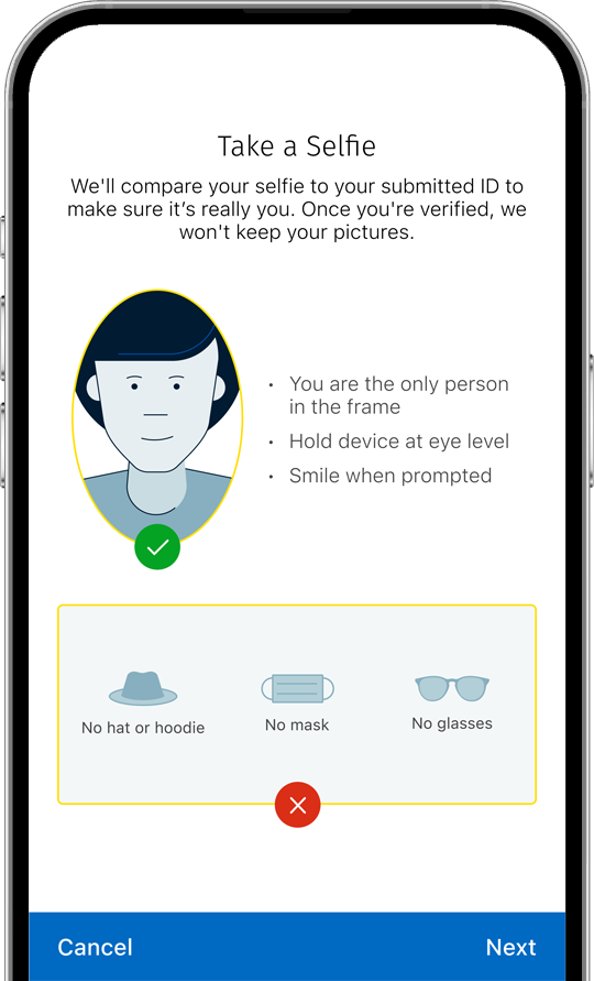 Scan the QR code with your mobile device’s camera, upload a photo of your government-issued ID and take a selfie.