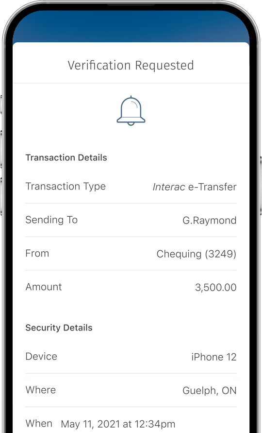 2-Step Verification provides an extra layer of security to your Online and Mobile banking experience. Every time you log into your account, after entering your username and password, you will receive a notification on a trusted device asking you to allow the login. We may also ask you to verify your identity to complete certain banking operations, like sending an Interac e-Transfer.